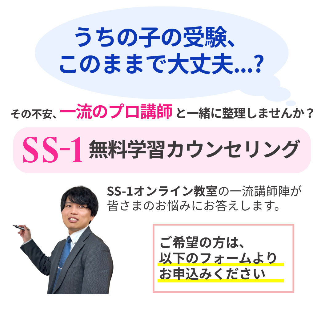 中学受験は未来への大切な挑戦です。お子様が心の安心を得て、笑顔で目標に向かえるよう全力でサポートいたします。ぜひ一度、SS-1オンライン教室へお気軽にご相談ください。