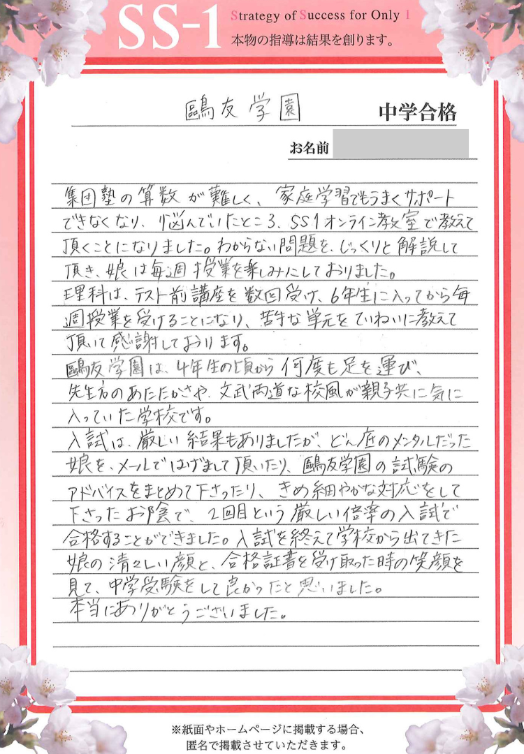 入試では厳しい結果もあり、どん底のメンタルだった娘を、メールで励まして頂き、試験のアドバイスもまとめて下さいました。そのきめ細やかな対応のお陰で、高倍率の2回目入試で無事合格できました。入試を終えた娘の清々しい顔と、合格証書を受け取った時の笑顔を見て、中学受験をして本当に良かったと思いました。熱心なご指導、本当にありがとうございました。