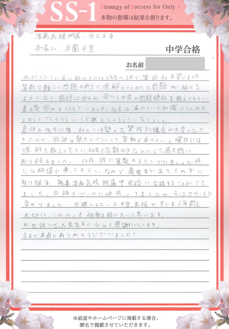6年生の11月に勉強がしんどくなって集団塾を休みましたが、SS-1に通っていたので勉強を続けることができました。先生方、ありがとうございました。中学生になっても頑張ります。