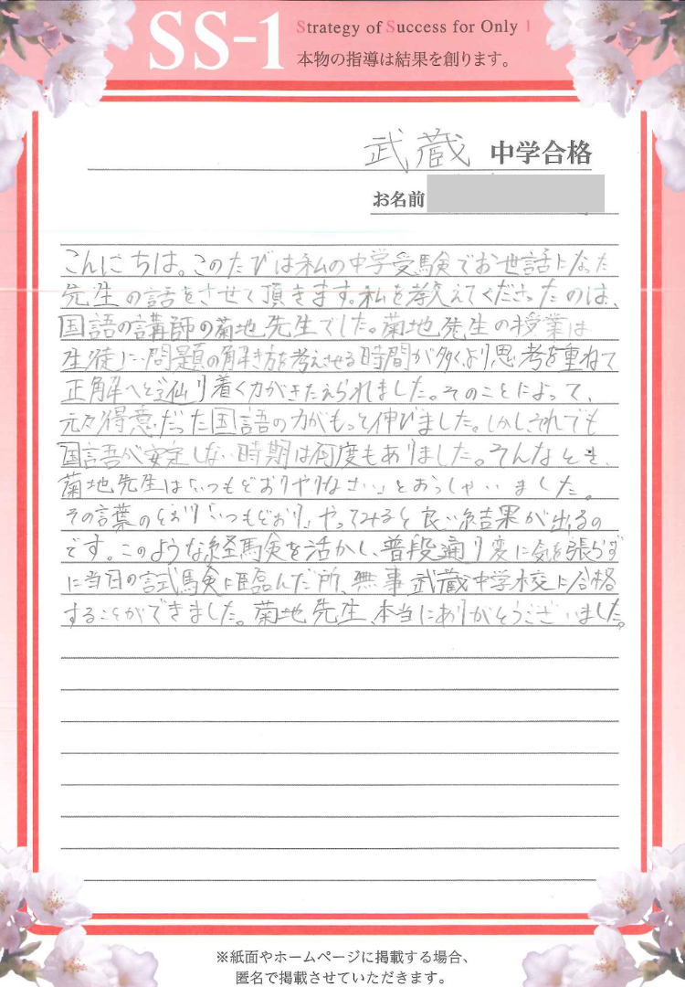 それでも、国語が安定しない時期は何度もありました。そんなとき、菊地先生は「いつもどおりやりなさい」と言ってくださいました。その言葉のとおりにやってみると、良い結果が出るのです。こうした経験を活かし、試験当日も変に気を張らずに臨んだところ、無事に武蔵中学校に合格することができました。先生、今まで本当にありがとうございました。