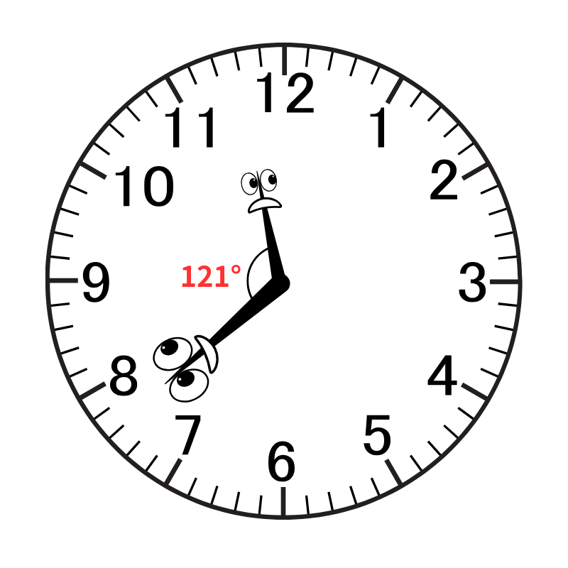 11時38分の小さい方の角度は「330° - 209° = 121°」となります。