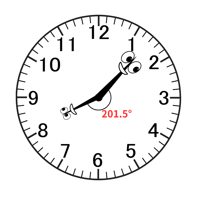 8時7分のときの角度は「240° - 38.5° = 201.5°」となります。